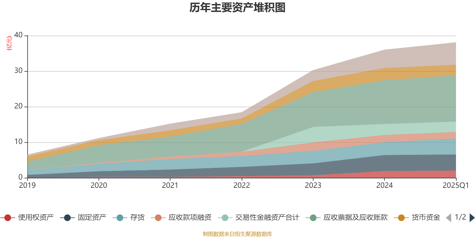资产重大变化方面,截至2025年一季度末,公司存货较上年末增加24.93%,占公司总资产比重上升1.82个百分点;货币资金较上年末减少12.84%,占公司总资产比重下降1.67个百分点;预付款项较上年末增加60.17%,占公司总资产比重上升1.61个百分点;交易性金融资产合计较上年末减少6.41%,占公司总资产比重下降0.98个百分点。